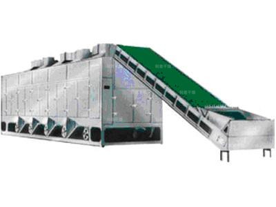物料由加料器均勻地鋪在網帶上,網帶一般采用12-60目不銹鋼絲網,由傳動裝置拖動在干燥機內移動。干燥機由若干單位組成,每一單元熱風獨立循環,部分尾氣由專門排濕風機排出,廢氣由調節閥控制,熱氣由下往上或由上往下穿過鋪滿物料的網帶完成熱量與質量傳遞的進程,帶走物料水份。網帶緩慢移動,運行速度可根據物料溫度自由調節,干燥后的成品連續落入收料器中。上下循環單元根據用戶需要可靈活配備,單元數量可根據需要選取。
